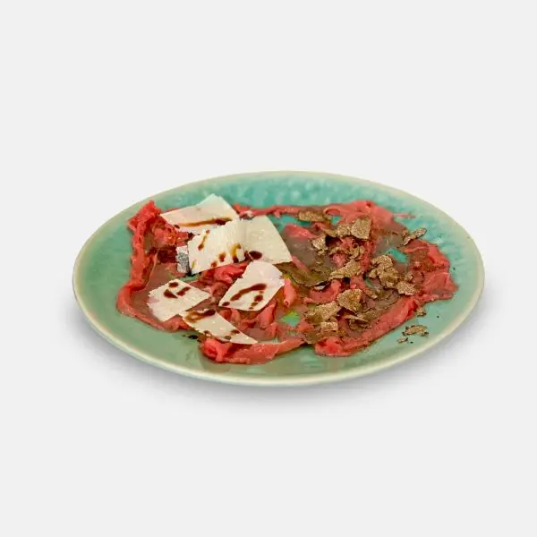 Schik nu de sneetjes carpaccio op de individuele borden, 4 sneetjes per bord. Garneer linkerkant met een paar druppels oude balsamico en de rechterkant met fijn geschilferde of geraspte verse truffel. Garneer met de parmigiano reggiano. Als je schilfert met de truffelschaaf bekom je flinterdunne schilfers van parmigiano die zeer decoratief zijn.